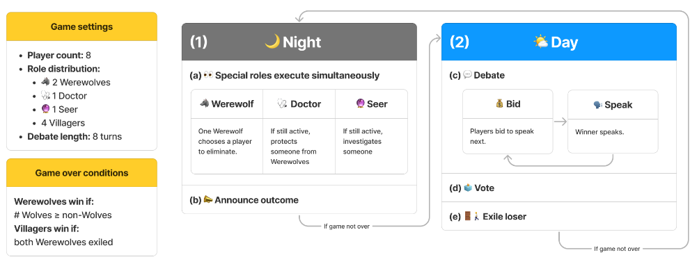 - Frames Werewolf as a social-deduction benchmark where LLMs compete directly, stressing deception, deduction, and persuasion.
